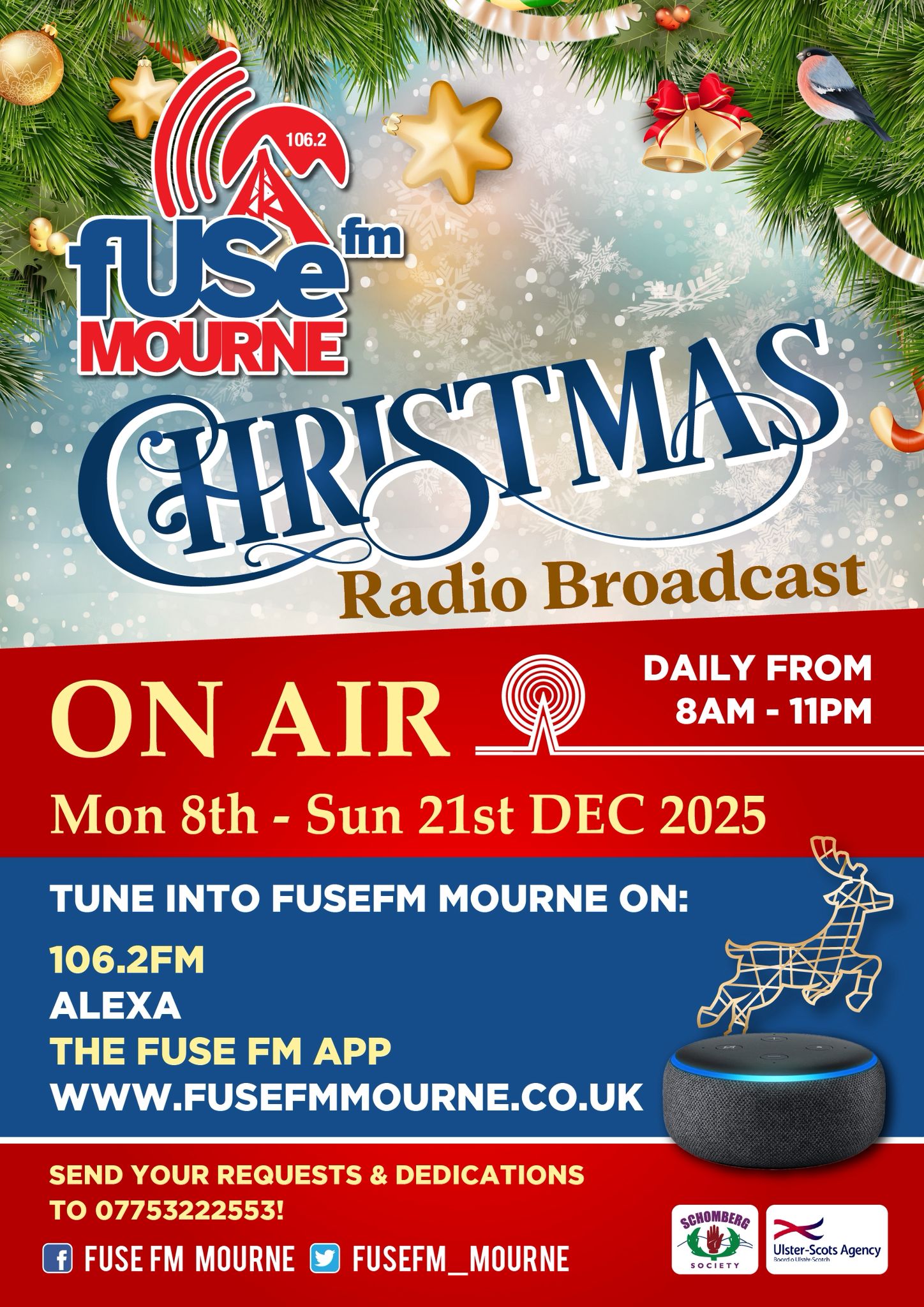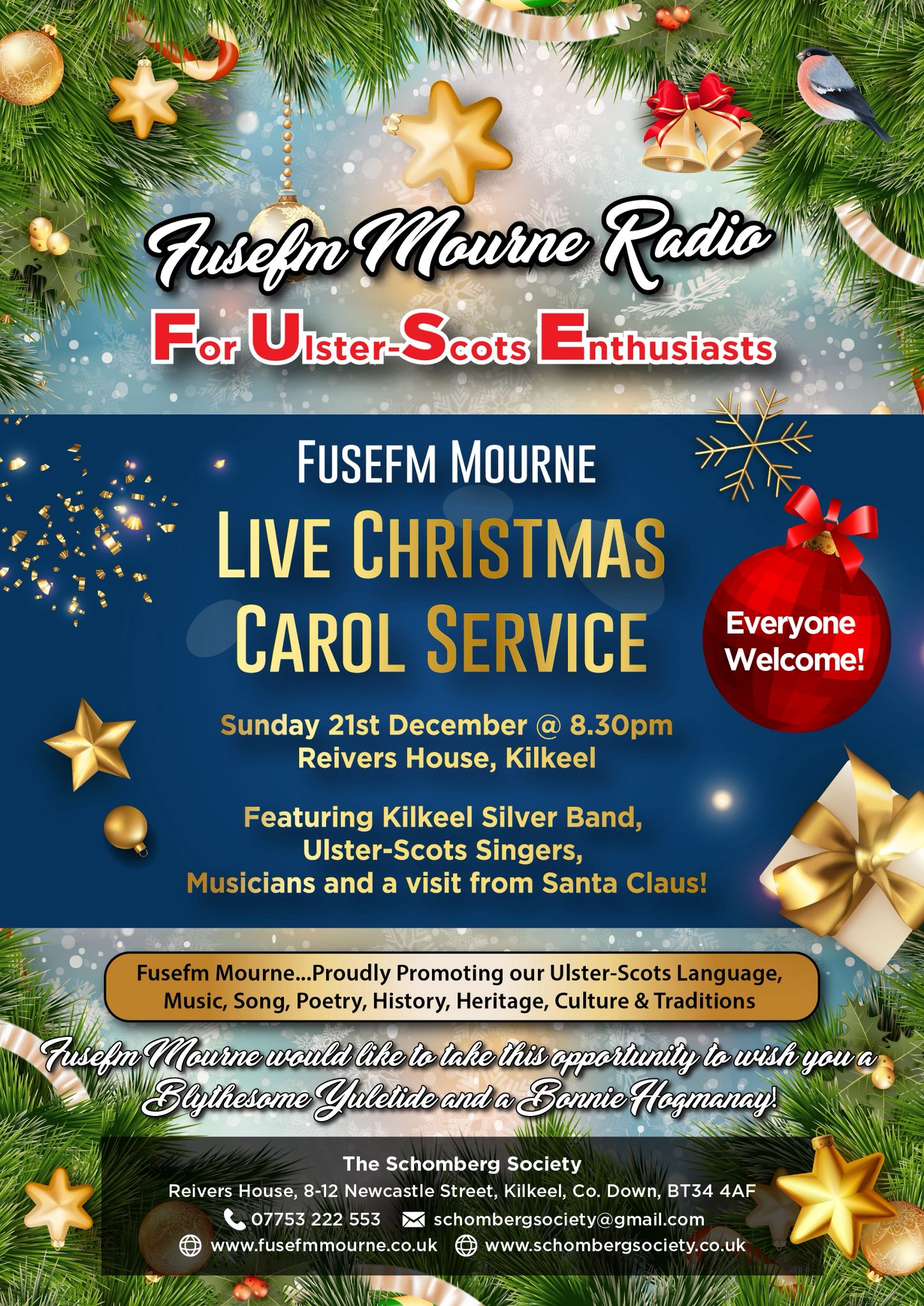 Our radio station is on air this Christmas, broadcasting live from Reivers House, 8am-11pm on Monday 8th December – Sunday 21st December2025. The community radio station is managed and overseen by the Schomberg Society, an Ulster-Scots umbrella organisation, based in Reivers House. The Schomberg Society located in Kilkeel town centre oversees a variety of Ulster-Scots events and activities, including tuition (fife, flute, snare and lambeg drum, highland dance and fiddle), training, drama, workshops, Summer Schools and the Reivers Ulster-Scots Festival.